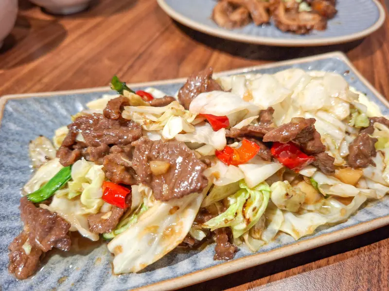 除了火鍋之外,主廚滷味拼盤也很令人驚喜,牛筋入口即化,牛腱滷得非常香,牛肚則帶點嚼勁但不會過硬,這個組合非常下飯,也很適合當下酒菜。炒牛肉是另一個特色,這次選了高麗菜拌炒,清甜菜汁跟牛肉的鮮嫩交織在一起,火候掌握得剛剛好,香氣四溢,是除了火鍋之外的另一個必點亮點。