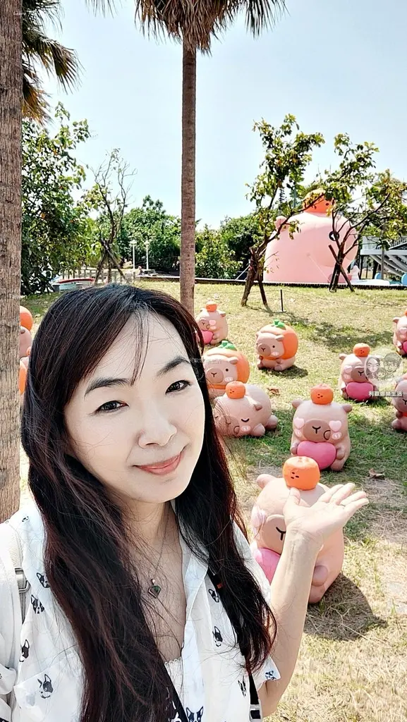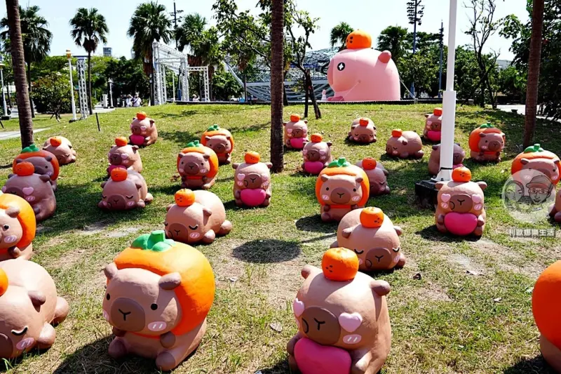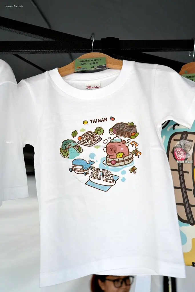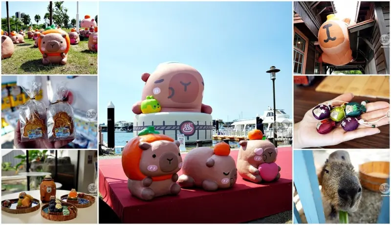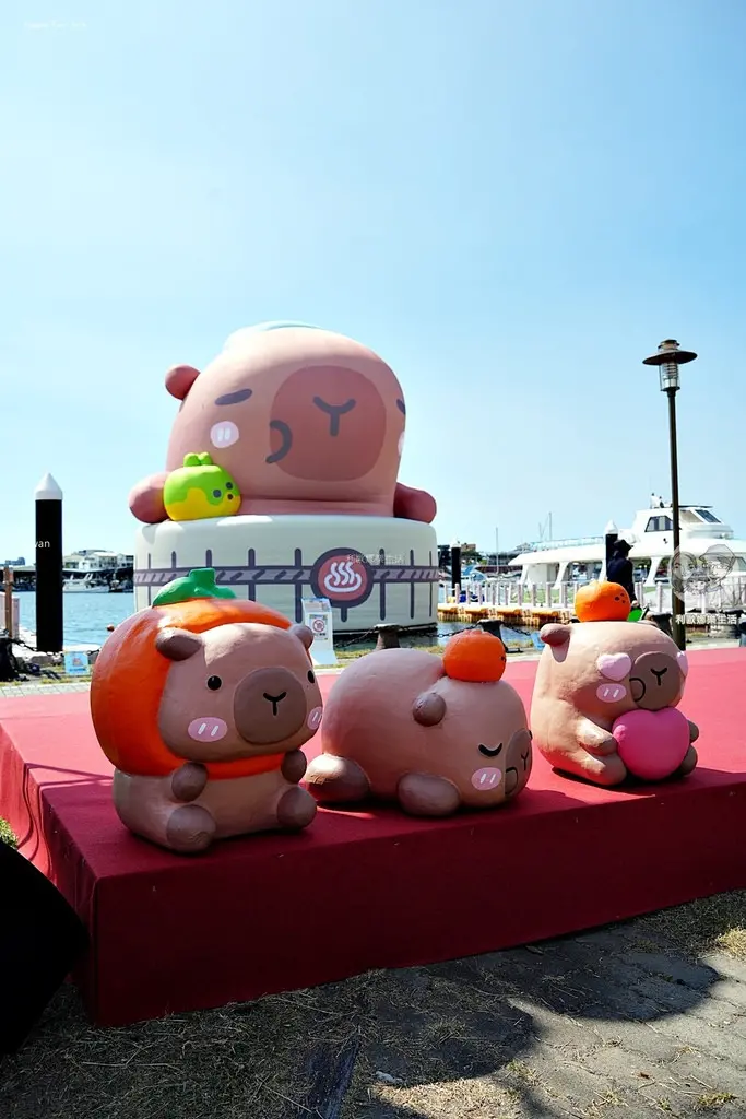 壓軸就是那一隻拿著在地特產青皮椪柑、又泡著溫泉的卡比胖拉,12米的高度非常壯觀,在水上漂浮的樣子更增添了一點愜意的感覺。拍完可愛的卡比胖拉,商品販售區有不少水豚玩偶、文具,也有作者推出的周邊小物,包括結合台南知名景點的T恤、實用的帆布包和飲料提袋,還有一系列的可愛扭蛋等著大家來收集。