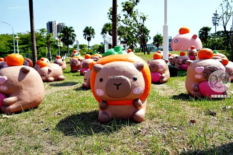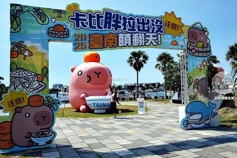 在這個活動現場,一定會讓許多女性朋友發出驚呼聲,因為有50隻超萌的水豚紙雕裝置,大家要注意小手勿動,不要觸碰這些裝置喔。這些紙雕裝置共有三種可愛造型,像是頂著橘子趴著睡覺的萌豚、眼冒愛心的戀愛豚,以及帶著小橘子頭套的水豚,經過大魚的祝福,就會先看到活動拱門,和那隻捧著擔仔麵、眼神晶亮的「滿福擔仔」,碗上還寫著「TAINAN」的字樣。
