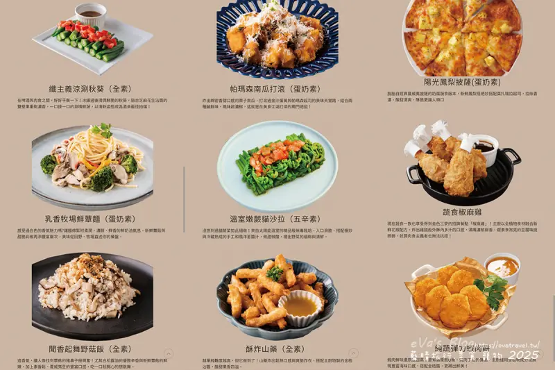 蔬食類:握握手小農溫沙拉、凱薩沙拉、BBQ美腿燒、帕瑪森南瓜打滾(蛋奶素)、酥麻川辣新魚柳(全素)、植想麻辣蔬食雞(全素)、韓醬走紅辣蟹餅(全素)等