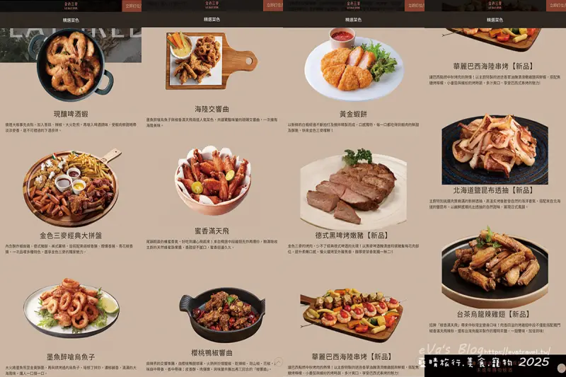 推薦精選菜色:現釀啤酒蝦、金色三麥經典大拼盤、蜜香飛滿天、櫻桃鴨椒響曲、德國黑啤烤嫩豬(新品)、華麗巴西海陸串烤(新品)、台茶烏龍辣雞翅(新品)等