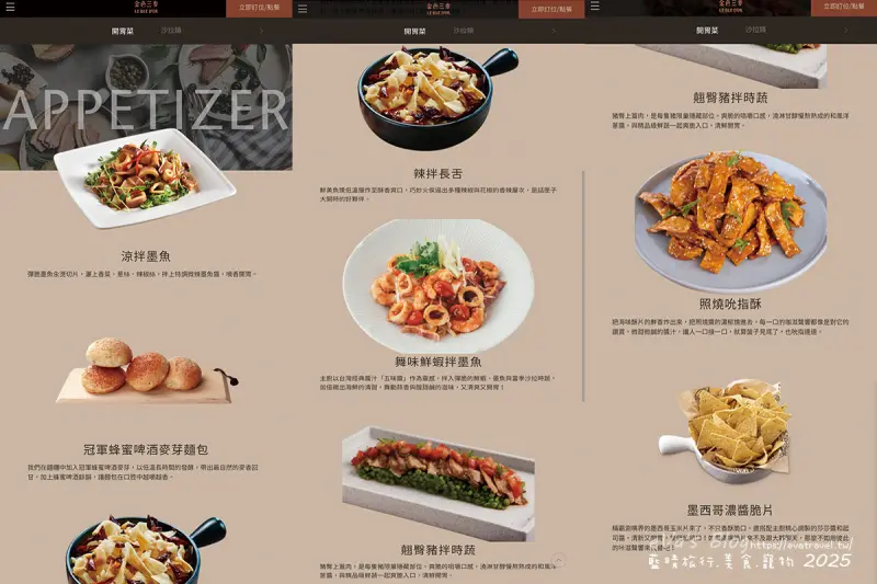 開胃菜:冠軍蜂蜜啤酒麥芽麵包、辣拌長舌、舞味鮮蝦拌墨魚、翹臀豬拌時蔬、墨西哥濃醬脆片等