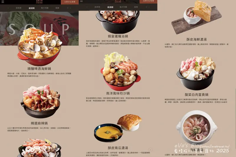 鍋湯類:精釀啤酒海鮮鍋、蝦皇暹羅浴鍋、南洋風味叻沙鍋、酸菜白肉富貴鍋等