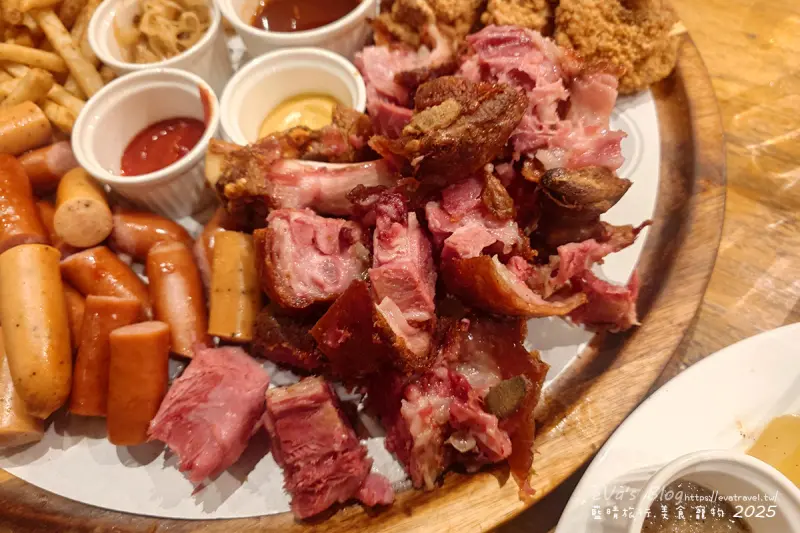 拼盤附 四種醬料:燒肉醬、蕃茄醬、蜂蜜芥末醬及德式酸菜,搭配內容物包括 酥炸椒麻雞、德國豬腳、美式薯條、黑胡椒香腸、煙燻香腸及青花椒香腸,多樣組合滿足不同口味,無論下酒或單吃都非常過癮,是聚餐必點的招牌菜色