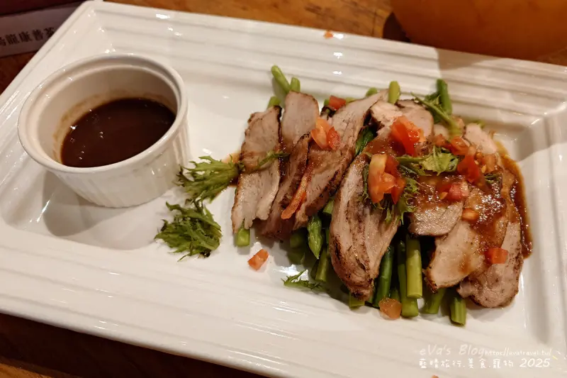 這道 翹臀豬拌時蔬 使用 豬臀上蓋肉,為每隻豬限量的隱藏部位,肉質 外脆內嫩,搭配 和風洋蔥醬 風味清爽、開胃,豬肉片底下鋪滿 新鮮蘆筍,增加口感清爽度,整體搭配既美味又健康,非常適合喜歡 創意豬肉料理 的饕客