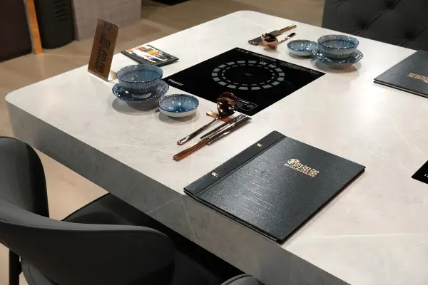桌子是大理石紋設計,質感滿滿;餐具也很精緻,和風碗盤搭配金色筷子與湯匙,整體用餐氛圍優雅又有儀式感。
