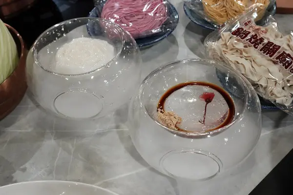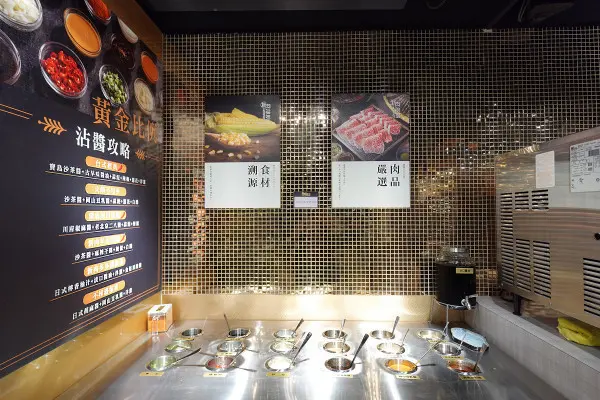 除了嚴選溯源食材和肉品,這裡的醬料區更是寶藏,光是佐料就近二十種,除了蔥花、沙茶這些基本款,還有老北京二八醬、銷魂海皇醬和麻辣乾碟等特別選項,旁邊還貼心附上沾醬攻略。