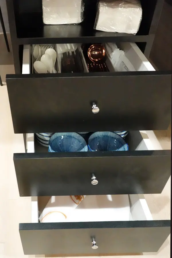 細節上也很用心,桌上就有垃圾桶和餐巾紙,桌子下方還能拉出抽取式面紙,桌子下方的抽屜裡還有牙線、濕紙巾、餐具和不織布圍兜兜,可以自己拿,超方便。