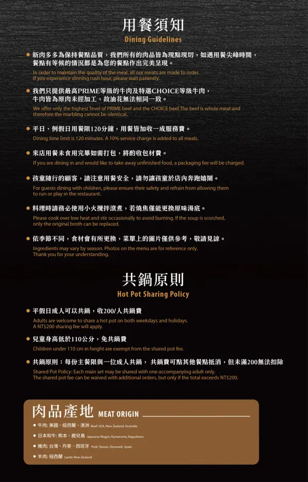 新肉多多是非吃到飽的,用餐時間是120分鐘,會加收一成服務費。小朋友收費規則也很貼心,小孩身高110公分以下完全免共鍋費;大人不論平日假日,共鍋每人只要200元,而且這筆費用還能全額折抵其他餐點,等於是花在自己身上,完全不浪費!每個套餐僅限搭配一位成人共鍋,既公平又彈性,讓聚餐更輕鬆自在。