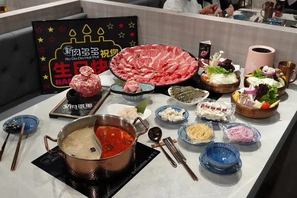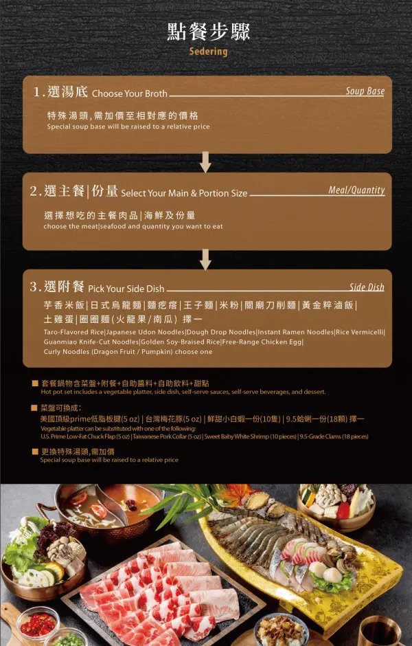 新肉多多用餐採鴛鴦鍋,顧客可自選湯頭;所有套餐均含副餐、菜盤與飯後甜點。單人用餐的話可選一種湯頭、另一邊以開水填充。
