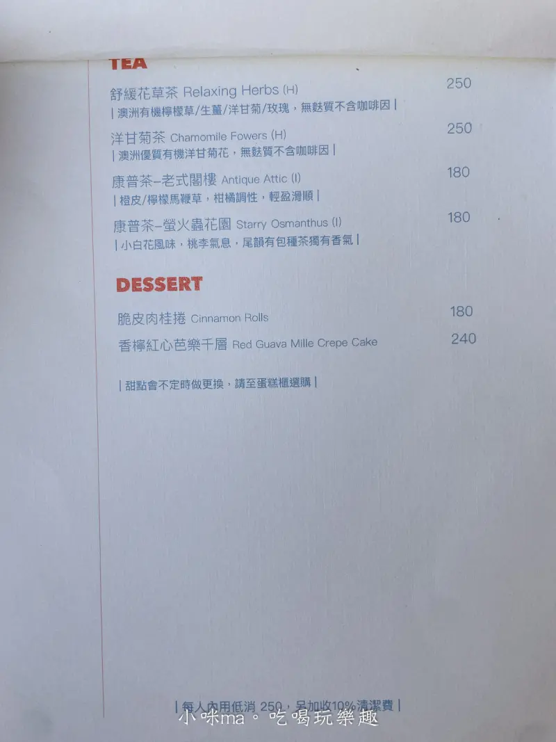 小日波餐點以甜點與飲品為主,非常適合用餐後過來坐坐,享受下午茶時光。低消為每人 250 元+10% 服務費,雖然比一般咖啡廳稍高,但搭配整片無敵海景,我覺得完全值得。