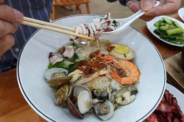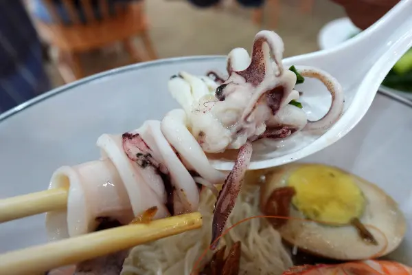 湯頭鮮甜,米粉也煮得剛剛好、細緻卻有彈性,不會一夾就斷也不會煮到軟爛成一坨。米粉入口滑順,咀嚼時還能感受到淡淡的Q勁,吸滿湯汁的米粉每一口都是鮮甜小卷味和雞湯底融合的層次感,吃起來既清爽又帶勁,完全不會膩!