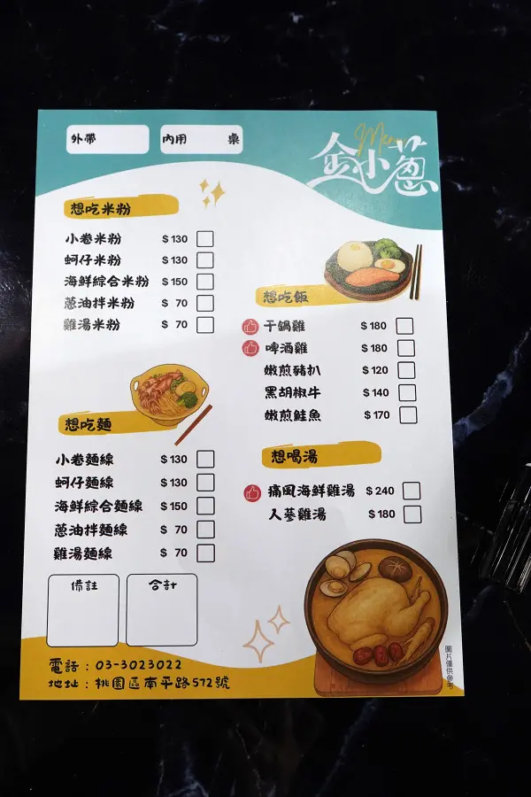 金小蔥雞湯米粉目前只接受現金付款,他們家點餐也很簡單,填好點餐單之後先付款,餐點好了之後就會有服務人員親自幫你送上桌。如果你想外帶,建議可以先打電話預約,這樣就不用在現場等太久。