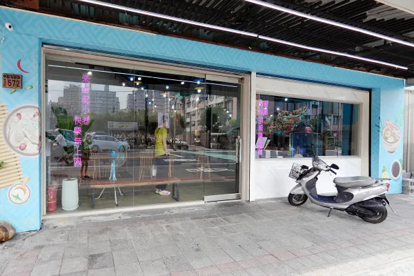 店門口的大片玻璃讓人就覺得開闊、舒服,玻璃上那兩條桃紅色的直式標語:「雞湯好吃到想談戀愛」「米粉配小卷快樂無上限」活潑又俏皮,文字跳出來跟你說話,既青春又趣味,讓路過的人忍不住多看兩眼,拍照打卡效果也很不錯。