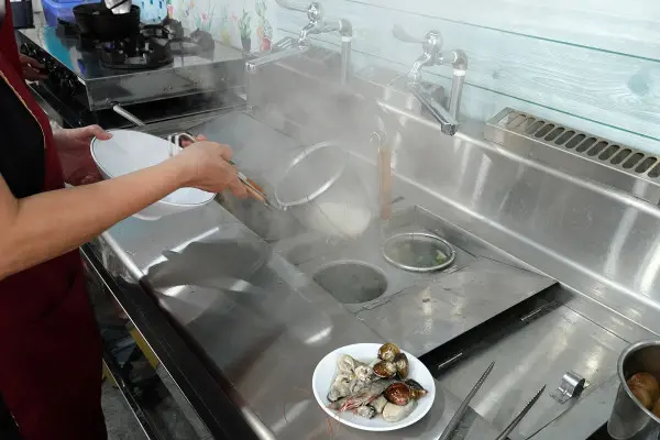 你沒看錯!這裡的鐵鍋裡面直接放上一整隻全雞,再堆滿滿的海鮮,光看就超澎湃。我在別的餐廳吃這種規格,沒有三四百根本跑不掉,但這裡卻只要銅板價加一點,CP值直接爆表。