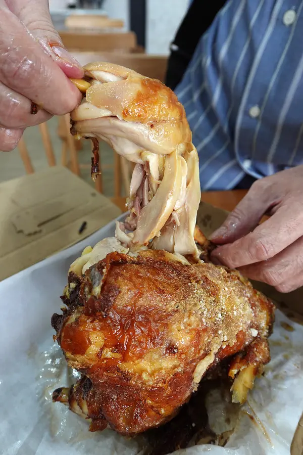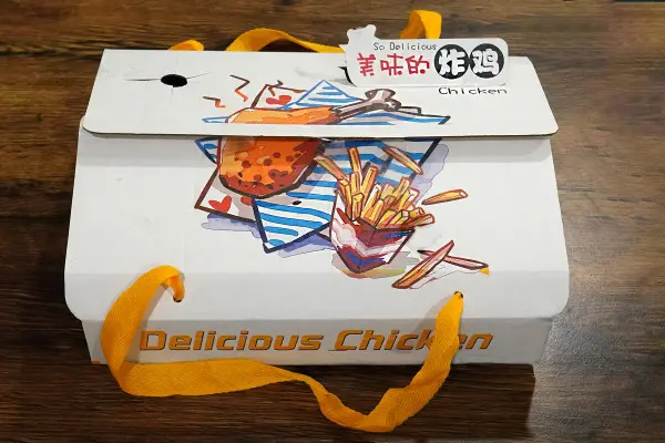 裝烤雞的扁平長方形的提盒設計也超讚!把上方的「美味的炸雞」字樣往上折,等於是讓盒子可以通風,這樣炸雞帶回家才不會因為水蒸氣悶在裡面而變得軟爛,可以一直保持外皮的酥脆口感,超貼心的啦!