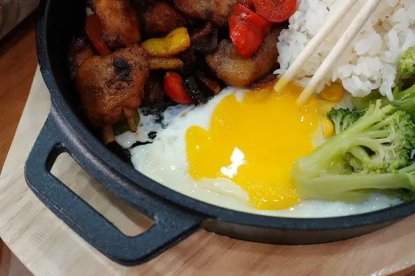 愛吃飯的親友點了他們的鐵板餐,干鍋雞的鐵板上旁邊還有附上半熟蛋跟花椰菜,看起來超有西餐的氣勢!