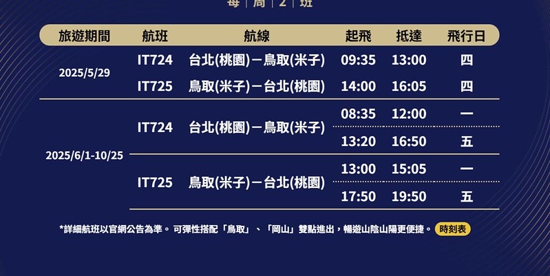 2025年5月後,虎航「米子/桃園」(每周兩班)線在談了許久後正式開通,對於我這個鳥取控來說就更方便了,也立馬買了6月底的來回機票。