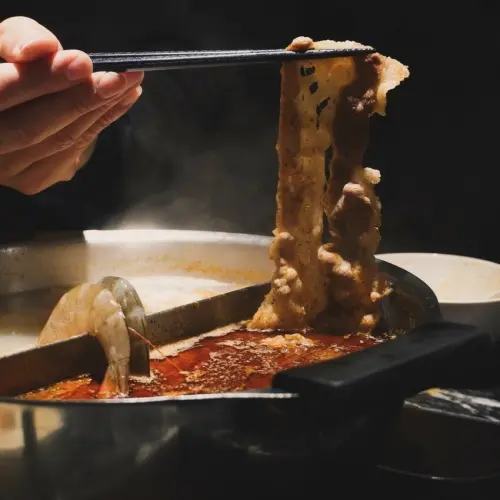 辣湯底口味香、麻、辣、甘。我小試了一下,友人吃的很辣,口味麻,香