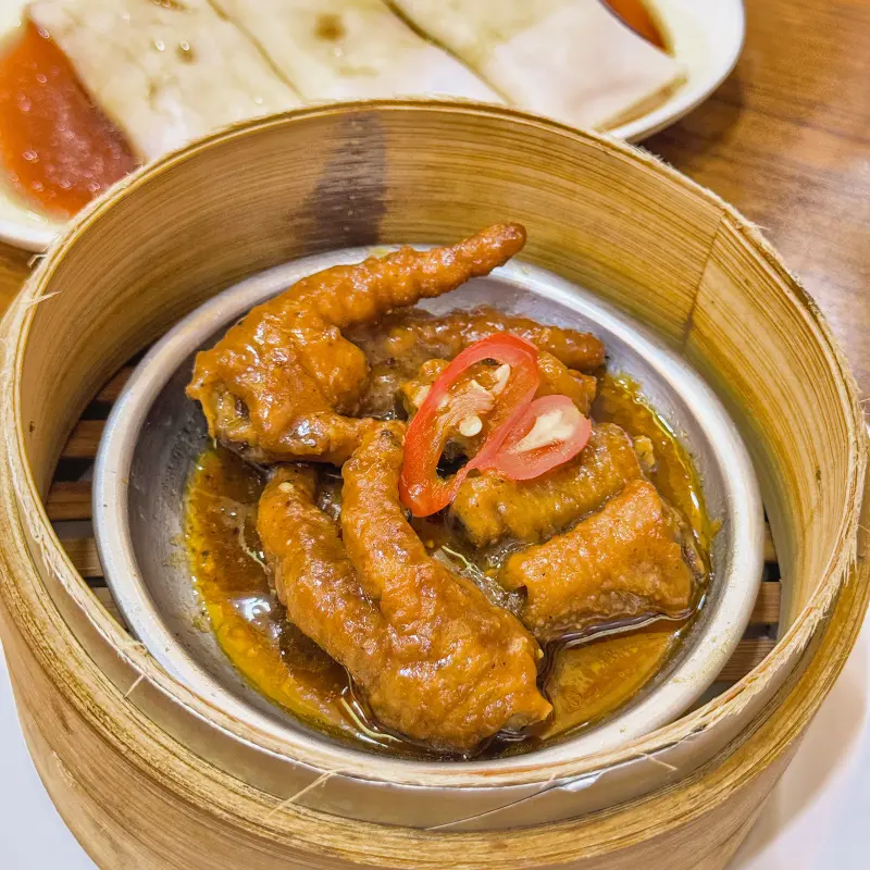 來到饕煲港式食堂,絕對不能錯過他們的港式點心,「古法鮮蝦腸粉」一份135元,腸粉皮薄嫩滑,包裹著一整隻的鮮蝦,口感Q彈,搭配特調醬汁,讓人一吃就上癮,「蠔皇柱候蒸鳳爪」一份85元,鳳爪蒸得非常軟爛,入口即化,醬汁鹹香夠味,是港式飲茶的經典必點。