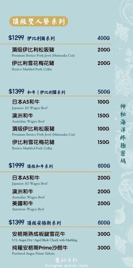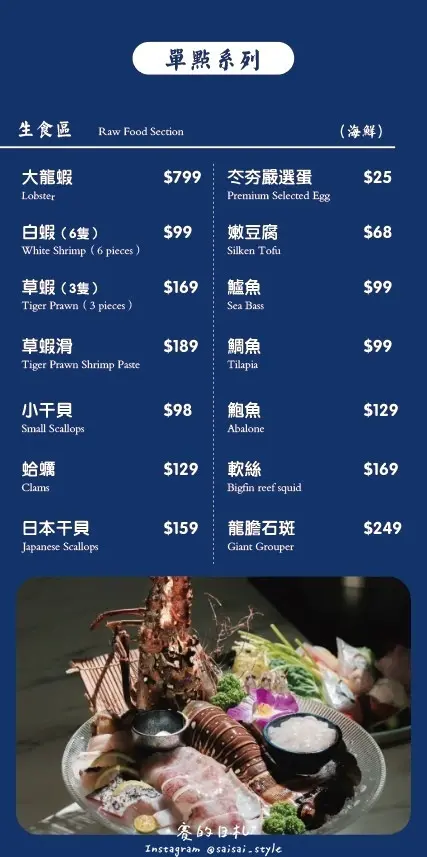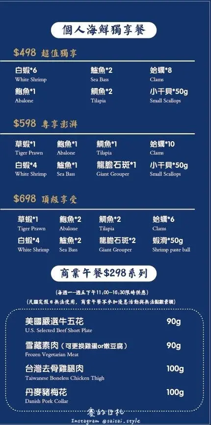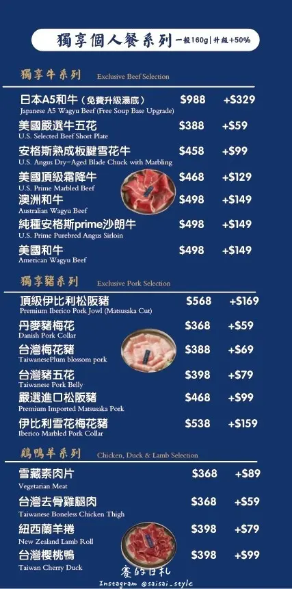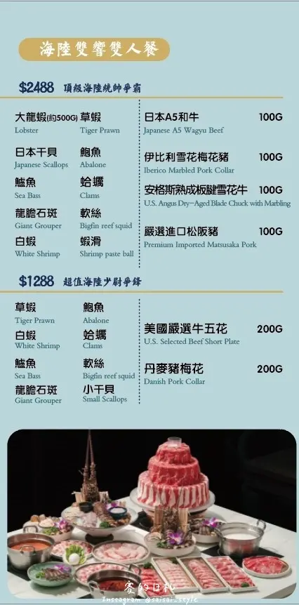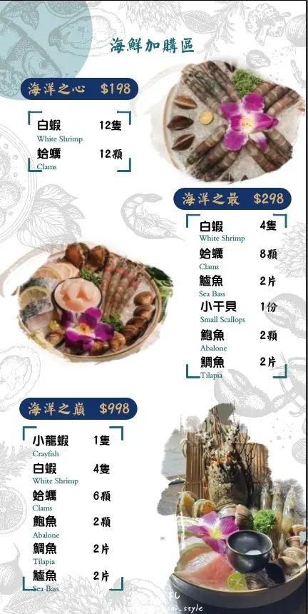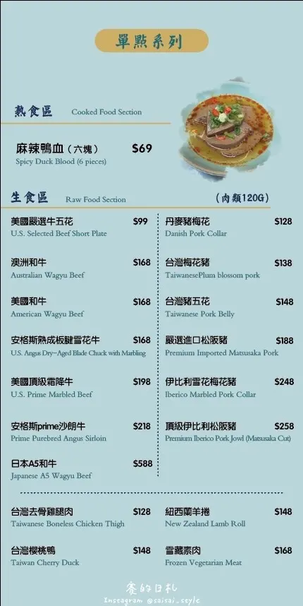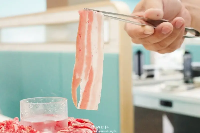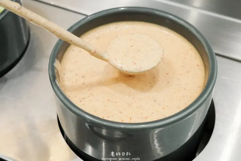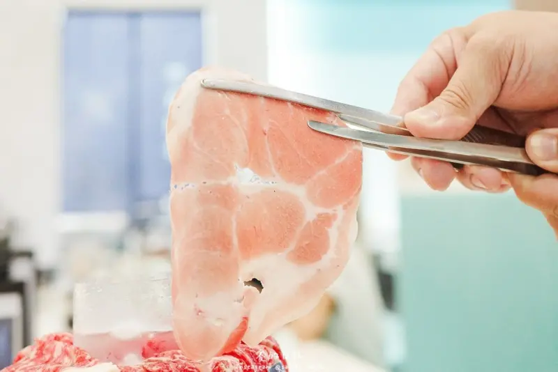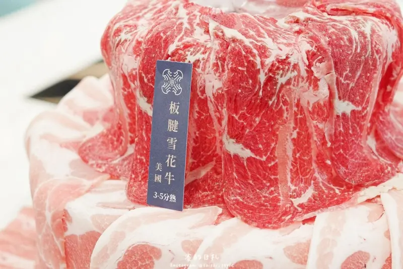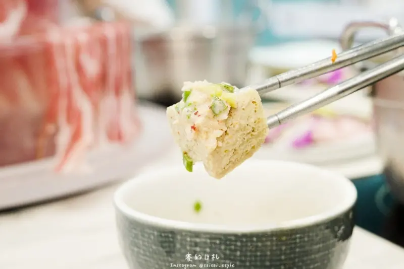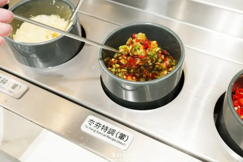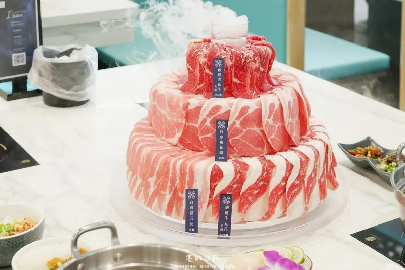 醬料區同樣不馬虎,除了基本的沙茶、醬油、蔥花之外,店家還特別研發了兩款獨門醬料,「冭夯特調」帶有果醋的酸甜,滋味清爽解膩,而「泡菜胡麻醬」則是將韓式泡菜與日式胡麻醬結合,香氣濃郁,兩者都與肉品、海鮮十分搭配。主餐部分,首次來訪的顧客絕對不能錯過視覺效果滿分的「3D立體肉蛋糕」,店家將4種不同的肉品層層堆疊,一端上桌就讓人忍不住拿起手機拍照,份量十足,絕對能滿足無肉不歡的饕客。