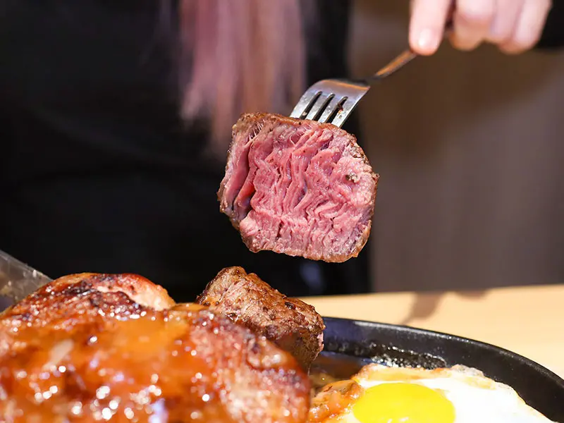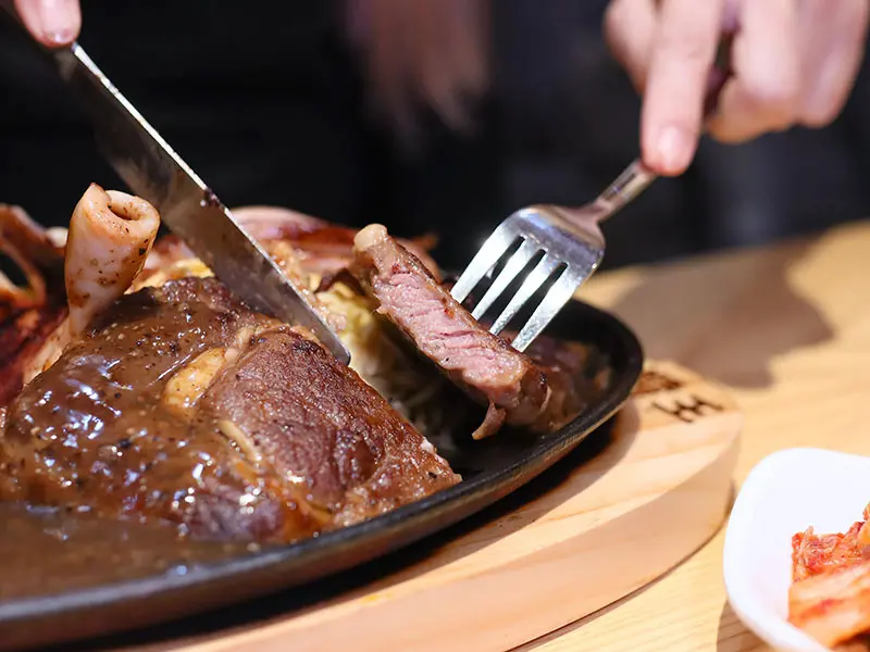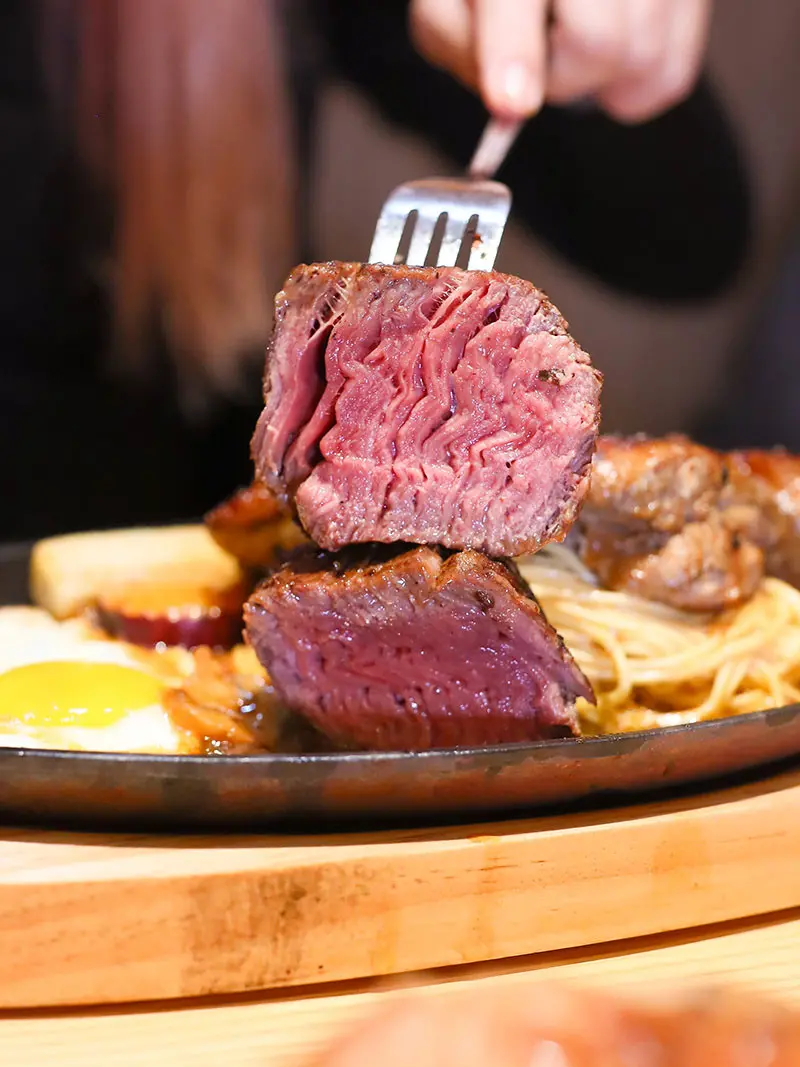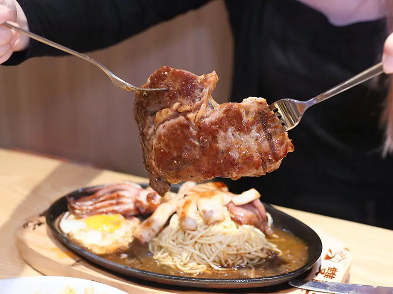 作為一家牛排館,主餐的表現才是靈魂所在,「雙醬王牛排」的排餐選擇多樣,從經典的「雙醬王沙朗」到柔嫩的「菲力牛排」,還有海鮮控喜愛的「香煎扁鱈魚排」等,每一份主餐都份量十足,鐵板滋滋作響地上桌,香氣撲鼻而來,肉質軟嫩多汁,搭配店家特色的黑胡椒與蘑菇雙醬,更添風味,最特別的是,這裡還提供現點現打的新鮮果汁,一杯「西瓜牛奶」下肚,清爽香甜的滋味正好化解了肉食的膩感,這種創新的搭配,也成為「雙醬王牛排」的一大招牌。