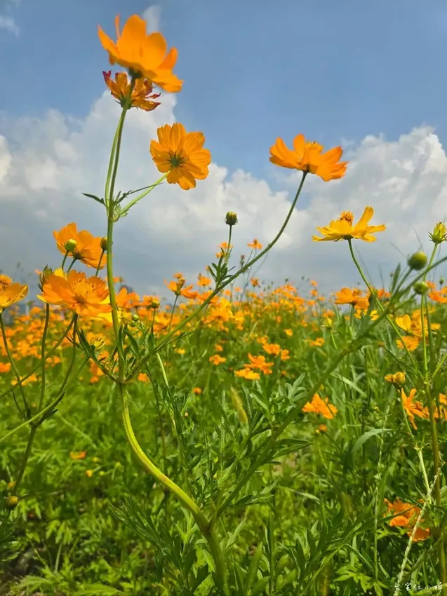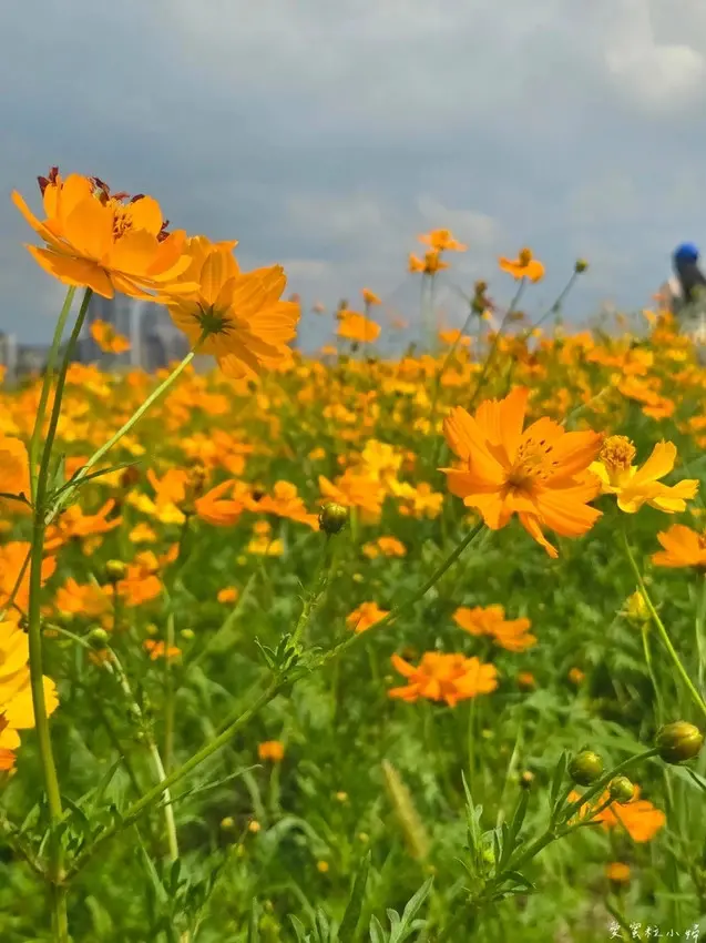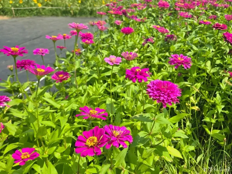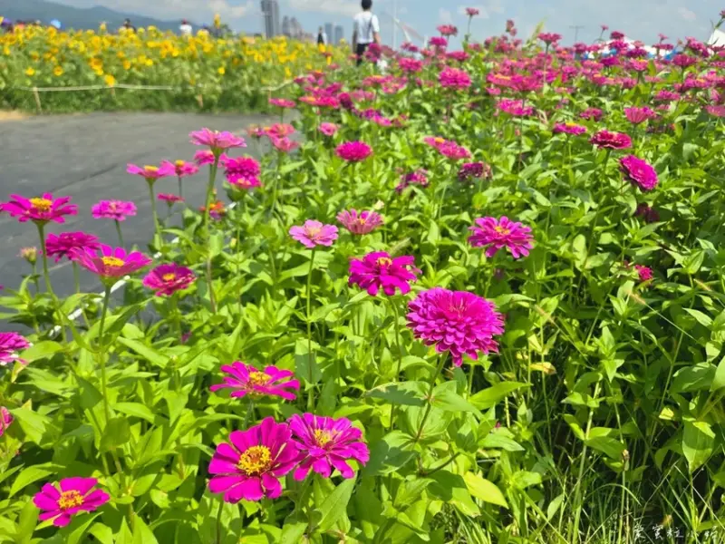 期間限定向日葵共18萬株,畢竟是主角佔比最大。這片花海中,還有百日草和金盞花一起綻放,株數雖然比不上向日葵,但其實一點也不遜色。