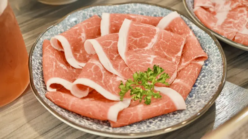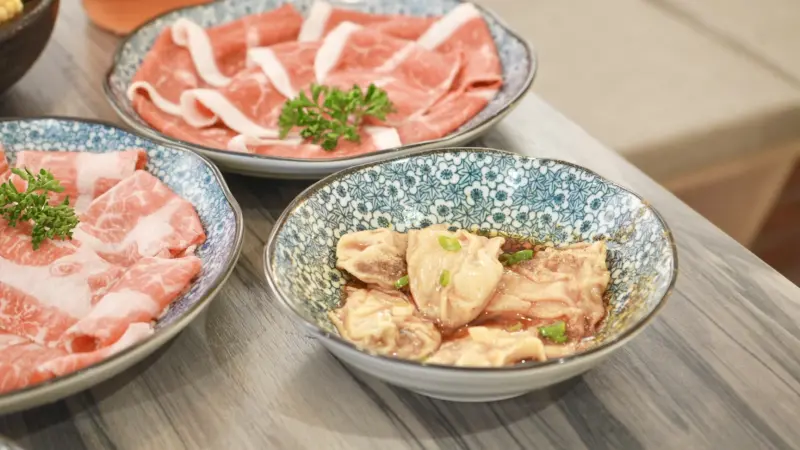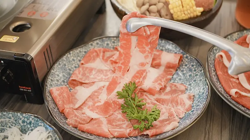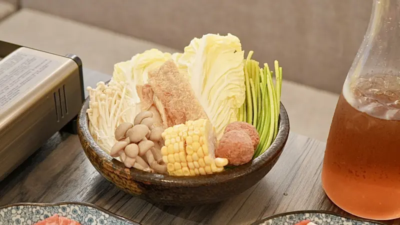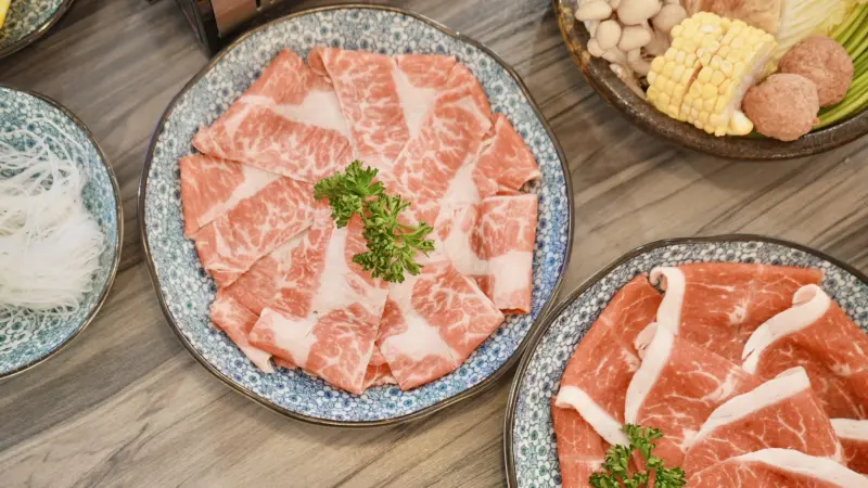 雙人套餐中包含兩份肉品,可以在牛五花、梅花豬、羊五花、雞肉中任選兩種,也可以加價換購其他肉品。這裡的肉品品質受到許多顧客肯定,例如最頂級的選擇「安格斯牛小排」,油花均勻,軟嫩的牛肉口感極佳。建議肉片不用煮太久,涮至五分熟即可享用,可以深刻感受到牛肉的香氣。另外,「美國頂級牛板腱」油花較少,適合喜歡吃 Q 彈口感牛肉的朋友。套餐還包含一份以青菜為主的蔬菜拼盤,適合不愛吃火鍋料的民眾。