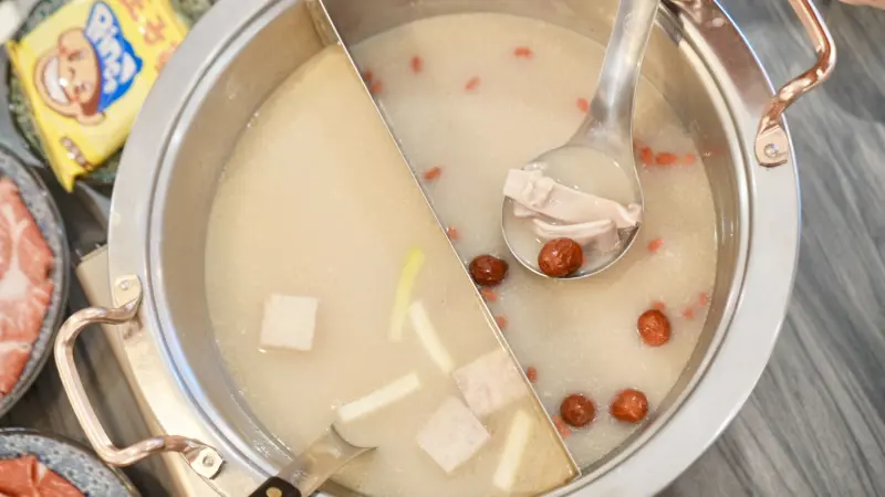 除了招牌的芋頭排骨鍋之外,九四火鍋師大店還提供了許多港式火鍋必吃的經典湯品,其中「胡椒豬肚雞鍋」就是另一項人氣選擇。在冬天冷冷的天氣裡,來一碗暖暖的胡椒豬肚湯真的非常幸福。對於不敢吃麻辣鍋的朋友們,這款鍋底是絕佳的替代品。