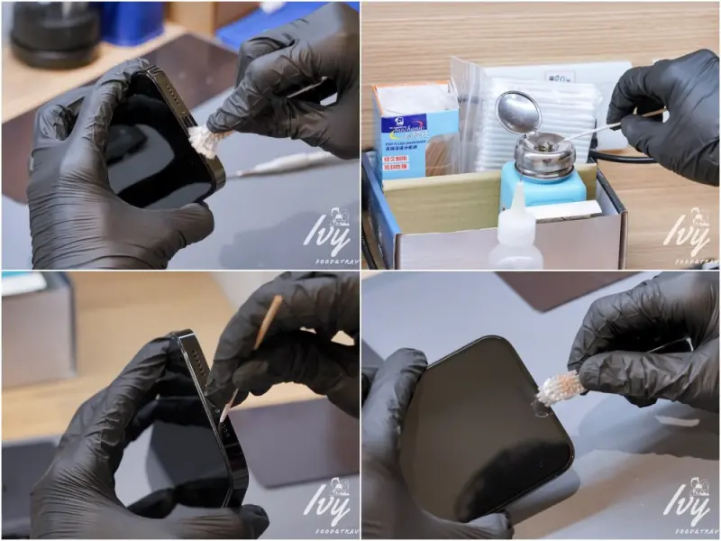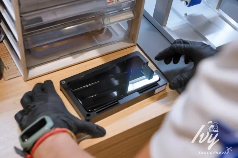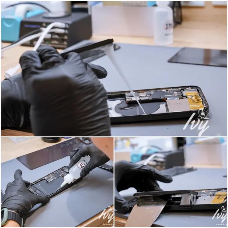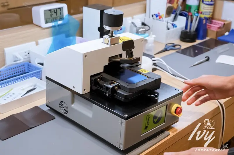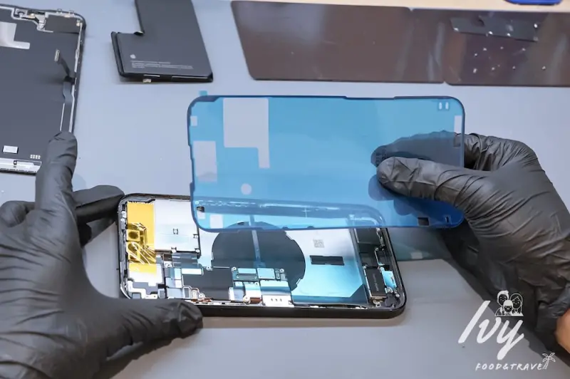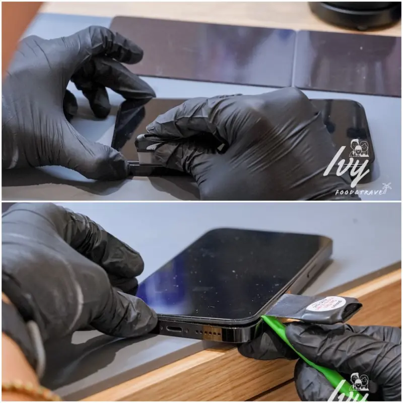 手機螢幕和背殻有用防水膠條緊密黏貼,所以在拆卸的過程要很小心,避免脆弱的手機螢幕受傷,鼎威有原廠設備和專用模具,操作過程很專業,也不必太過擔心螢幕問題,在旁邊看的我覺得很療癒。