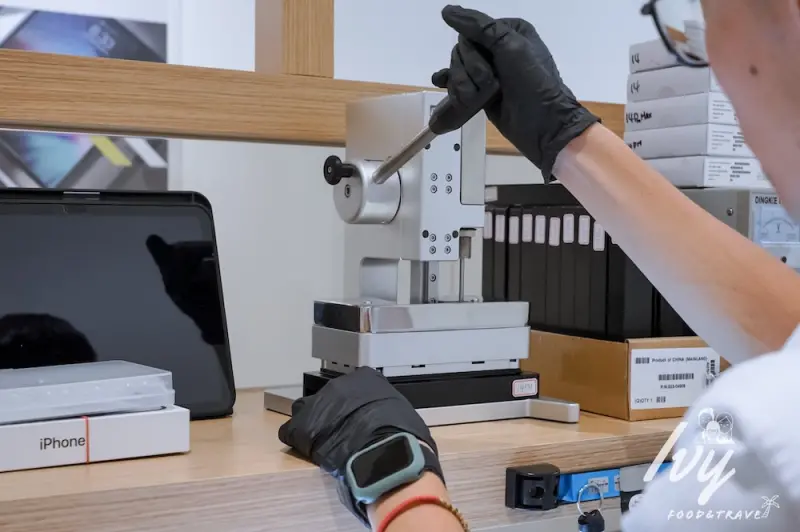 本以為螢幕蓋上就結束了,沒想到鼎威完全不馬虎,用原廠加壓器把背蓋和螢幕完整密封,讓防水膠條可以緊密貼合,這過程是原廠必要程序絕不能少,不然防水功能會失效。