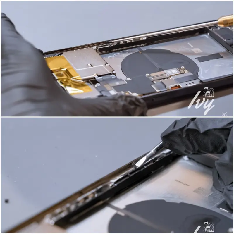 維修過程花最長的時間,就屬去除iPhone防水膠了!會使用專用儀器慢慢地去掉,沒去除乾淨的地方會再用一字起子慢慢刮,最後再用棉籤加酒精擦拭乾淨。
