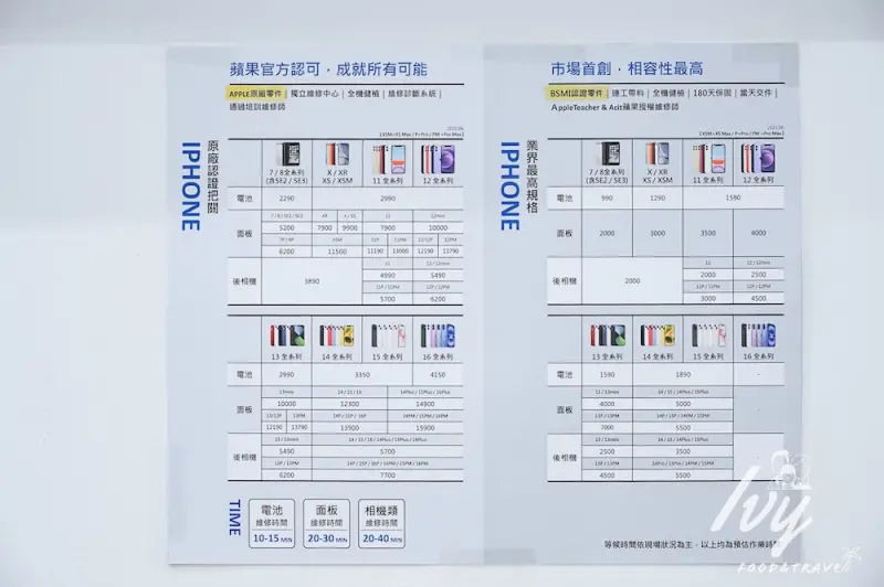 店員還會特別介紹原廠電池的優點,像是會顯示電池健康度,不跳出未知零件,以及不需要重灌系統、可以直接更新系統,同時還享有Apple原廠三個月保固。但若你有預算考量,BSMI認證零件價格實惠,會提供6個月保固,但系統會顯示「未知電池」哦~