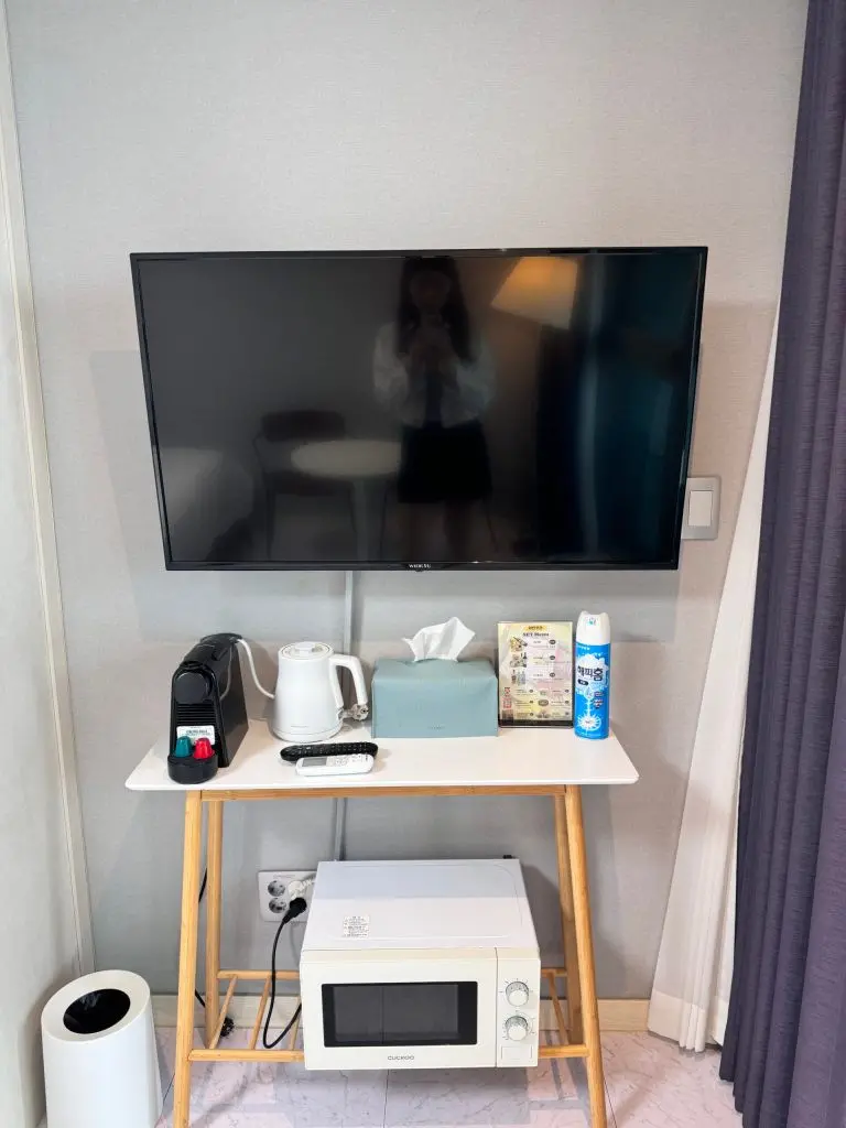 房間內中規中矩,乾淨舒適,有小廚房、廚具、乾溼分離的浴室、微波爐、電磁爐、滾筒式洗衣機、電視都有!雙人床也還算滿好睡的,床的前方有個小桌椅,晚上可以買消夜回來吃