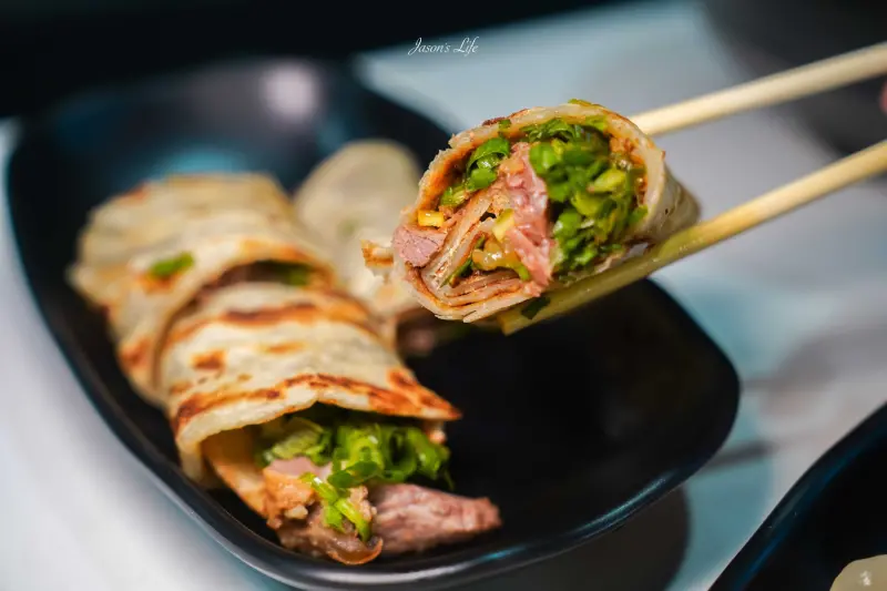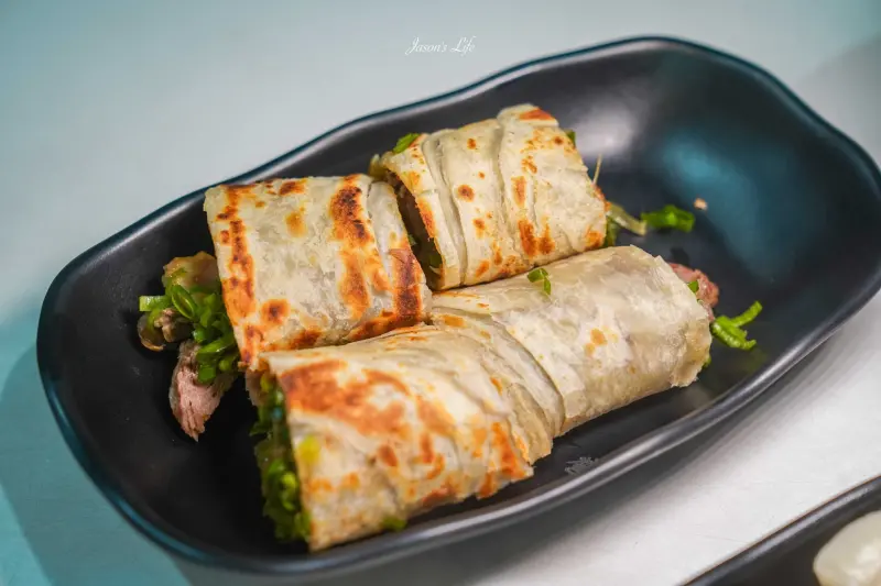 另外一個招牌人氣餐點就是【牛肉捲餅】,每份 100 元。牛肉捲餅採現點現做。大餅上塗有甜麵醬,並鋪滿了許多牛肉和蔥花。從側面看,整個內餡被塞得滿滿的。一口咬下,能感受到大餅的 Q 勁,加上牛肉的入味,隨後帶出甜麵醬的甜味,吃起來滿好吃也滿有飽足感。