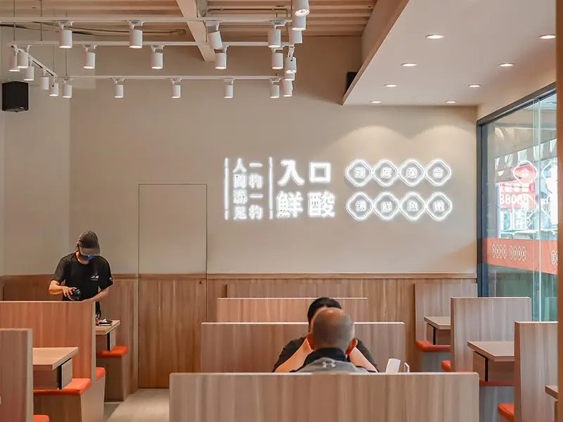 餐廳的空間氛圍以亮橘紅色為主基調,營造出溫暖色調。牆上繪有功夫貓作為店內的吉祥物,俏皮的姿態令人多看兩眼。店內大面積的落地窗引入自然光,搭配木質桌椅和柔和的燈光,呈現出簡約又舒適的氛圍。