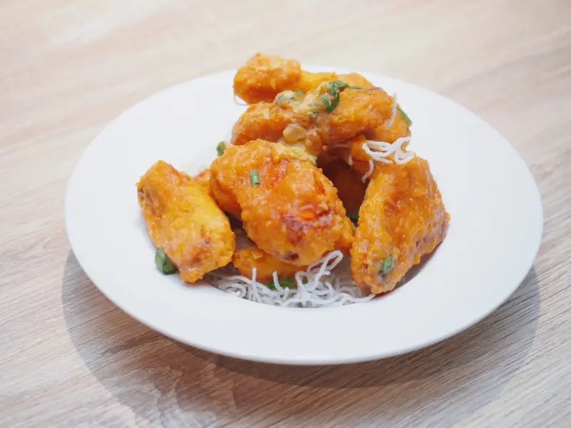 「金沙南瓜」售價 $250。將質地柔軟的南瓜包覆在綿密的金沙中,讓甘甜的南瓜吃起來帶有一種鹹香滋味,是非常下飯的一道菜。這道菜麵衣不會過厚,鹹蛋黃的風味卻能讓南瓜的甜度更有層次。