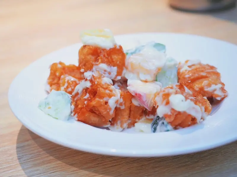 「果律百花油條」售價 $420。這道大人小孩都喜歡的菜色,將酥脆的油條中鑲入彈牙的蝦漿。搭配水果美乃滋沙拉涼拌,整體的滋味豐富,配上酸酸甜甜的鳳梨非常對味。