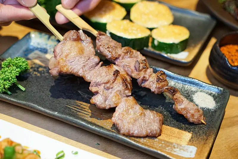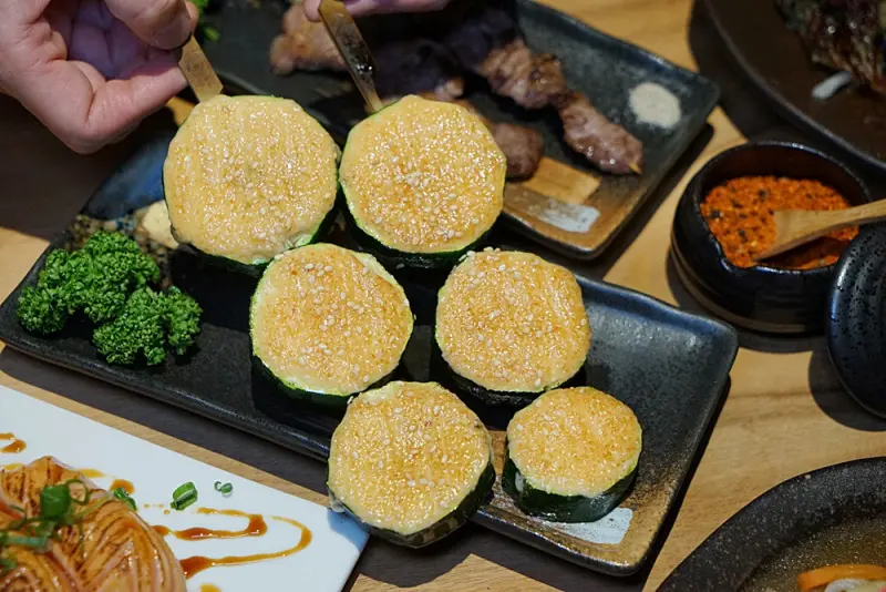 烤物方面,「和牛肋條」充滿油脂香,入嘴牛肉香氣足,有嚼勁的口感。串燒必點的「櫛瓜明太子」,櫛瓜吃起來清脆,搭配鹹香的明太子更是甜香。