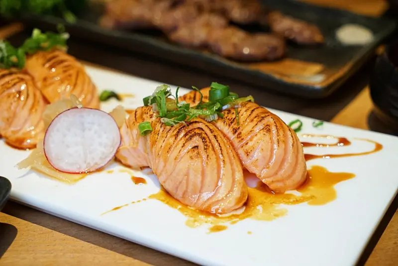 「比目魚握壽司」因為比目魚肉帶著豐富油脂,加上炙燒後油脂轉為鮮甜味來搭配醋飯。吃來腴滑鮮甜,有入口即化的口感。另外,「炙燒鮭魚握壽司」(六貫)採用炙燒的方式,讓鮭魚入口後化入醋飯中,帶有迷人的香氣。