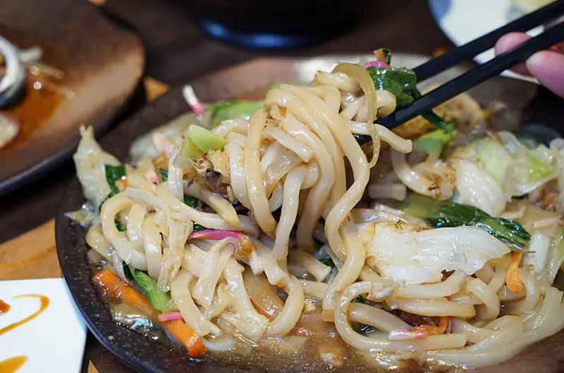 「現炒烏龍麵」採用讚岐烏龍麵拌炒時蔬,吃起來有彈性,吸滿了蔬菜的鮮甜味。