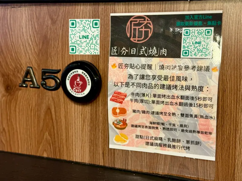 每桌牆上都還有貼心的燒肉熟度參考建議,以及服務鈴 ![]()