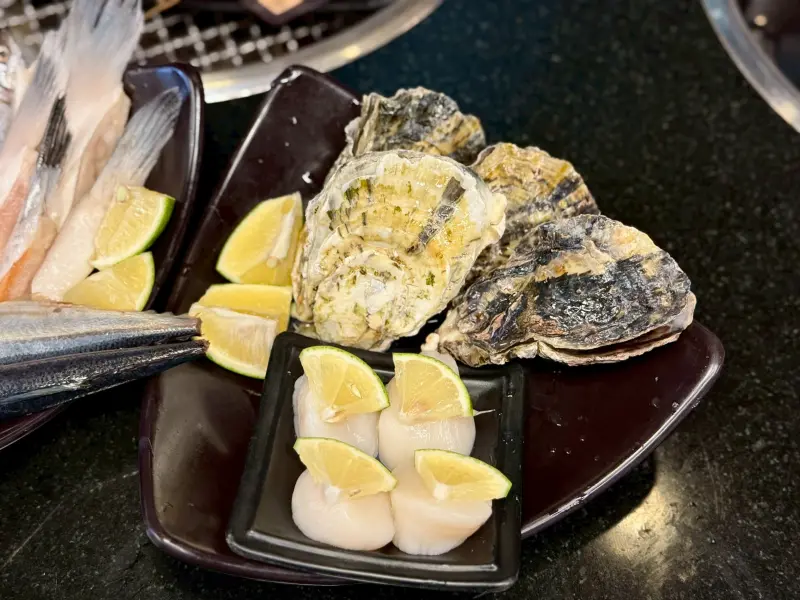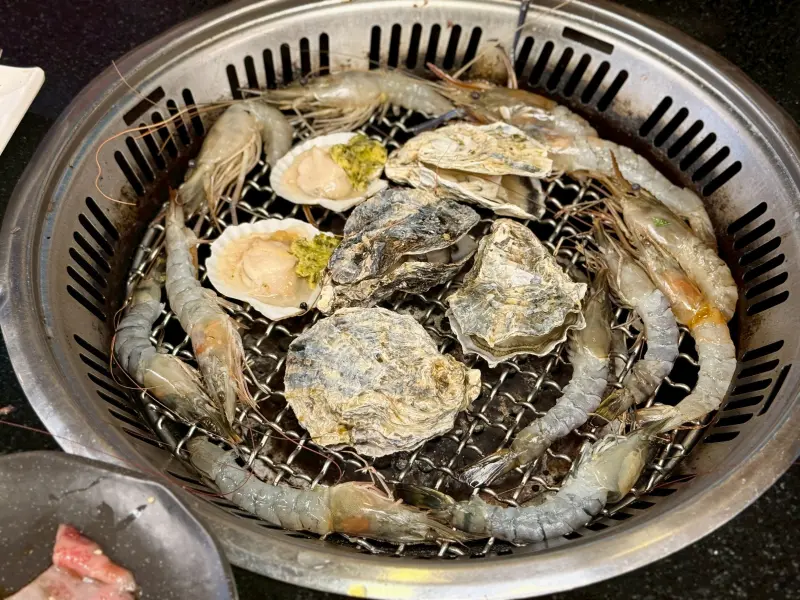 這天假日來訪,還沒開門就有客人在門口等了,進去沒有多久就全部客滿,不止出菜速度快、服務到位、品質在線,而且爐火也很強,難烤的扇貝帶殼類也一下就熟了,難怪客人門庭若市,而且吃到飽還有有專人剝蝦及代烤桌邊服務,第一次吃到飽也能吃出單點的高級感,難烤的肉品或是甜點請店員代烤後立馬美味度大幅提升,簡單的也可以自已享受烤肉樂趣,是桃園和牛吃到飽首選的燒肉餐廳