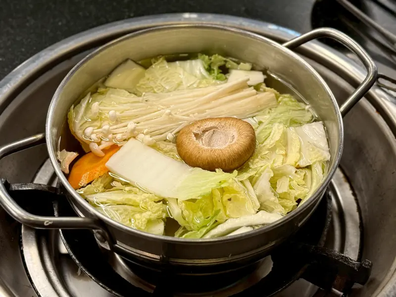 除了燒肉還有女兒最愛吃的火鍋,店家已經先把蔬菜先都放好了,只要開火很快就可以先吃到熱騰騰的火鍋