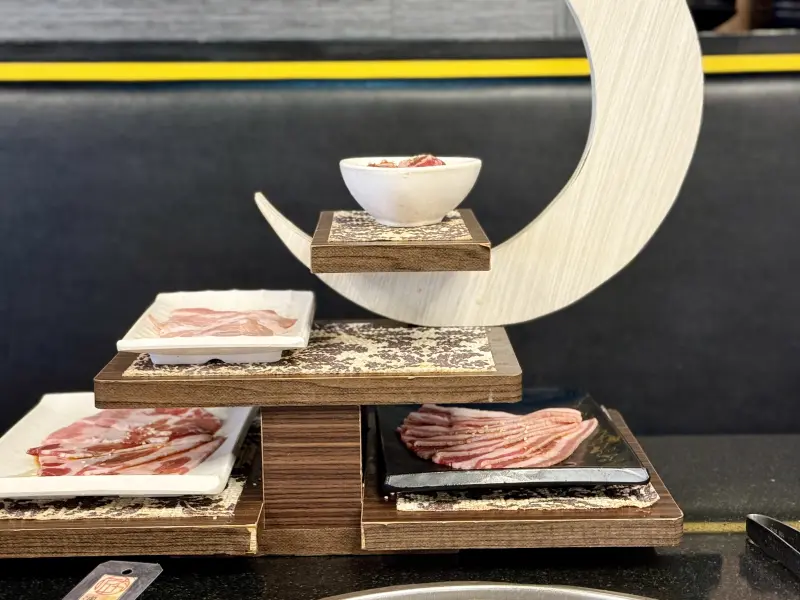 這次享用的是全部都能點的$1357頂級和牛海鮮吃到飽一來就先上超吸晴的月亮打卡基本盤盤有四種肉有美國牛肋條、西班牙松阪豬、國產梅花豬、熟成牛五花這四種![]()