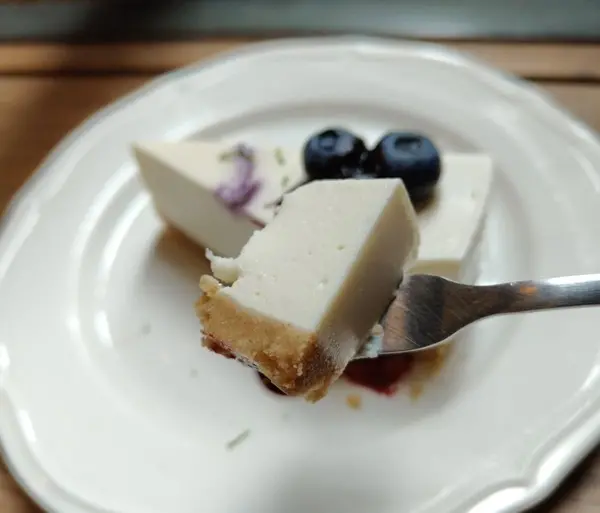 實際品嚐時,乳酪的質地細緻偏向果凍感,入口柔滑但不是濃厚型,奶香清淡,整體風味走清爽路線。