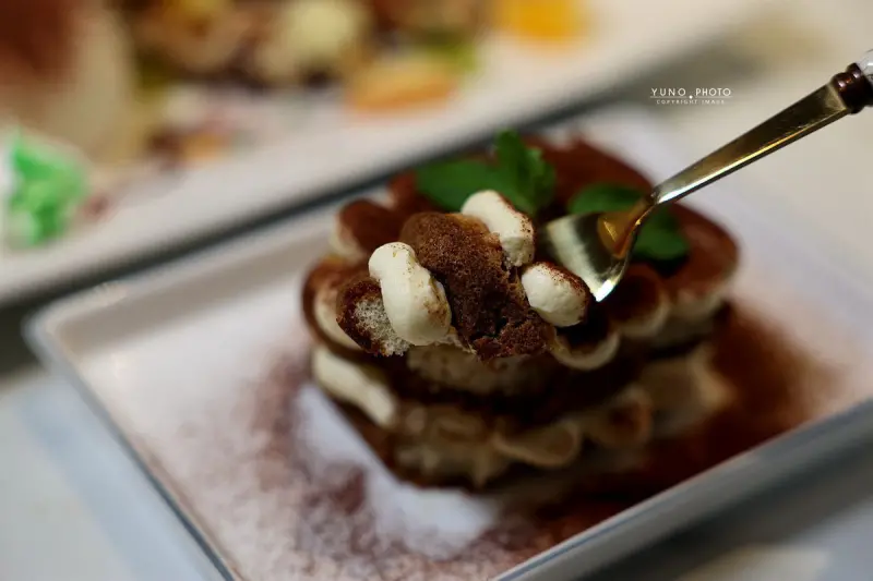甜點方面、經典義式甜點「提拉米蘇」綿密細緻、入口即化、表面覆蓋著厚厚的可可粉、留下濃郁的奶香。另一款「巧克力水果鬆餅」擺盤精緻、酥脆鬆餅搭配橘子、奇異果、蘋果等多種水果、淋上香濃巧克力醬及香草冰淇淋、口感層次豐富、非常具有吸引力。