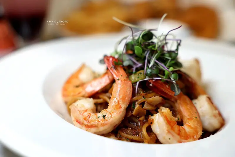 「蒜香手剝蝦義大利麵」是人氣招牌、它嚴選當季大白蝦現剝入菜、搭配當令蔬菜、以橄欖油清炒、佐上特製蒜香醬汁、將濃郁蒜香與鮮甜海味完美結合。