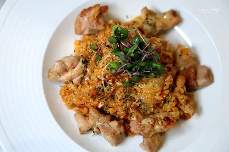 此外、富有異國色彩的「韓式部隊雞燉飯」也相當吸睛、金黃色的雞肉塊搭配紅豔的韓式辣醬與翠綠芽菜、色彩繽紛、米飯吸飽湯汁、口感豐富有層次。