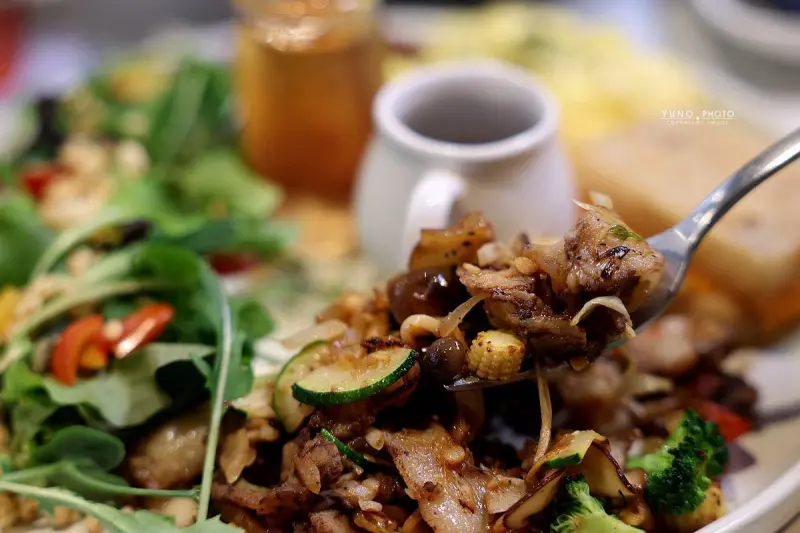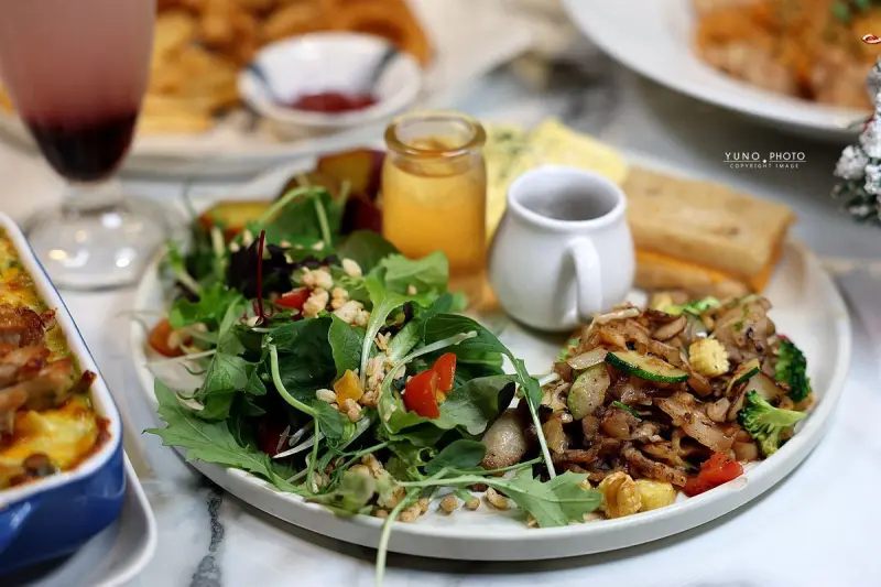 除了義大利麵、餐廳也供應具有地方特色的早午餐。例如「佩佩豬的台式小味」早午餐、以清爽沙拉搭配香煎蘿蔔糕、佐以和風柚子醬、再加上生菜、炒豬肉與地瓜、提供營養均衡且酸甜平衡的組合。